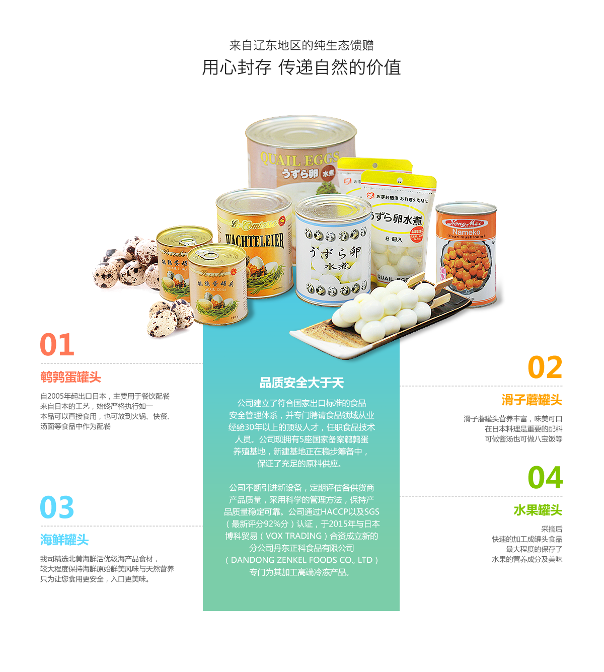 丹東日食食品有限公司是一家專注罐頭及速凍生產(chǎn)的食品加工型企業(yè)。公司主要產(chǎn)品為鵪鶉蛋罐頭、滑子蘑罐頭、冷凍產(chǎn)品等,年產(chǎn)量約5000噸。其中,鵪鶉蛋罐頭出口量位居近年國(guó)內(nèi)之冠;滑子蘑罐頭出口量也列國(guó)內(nèi)前位。各種產(chǎn)品主要出口日本,并遠(yuǎn)銷德國(guó)、澳大利亞、新加坡等國(guó)家和地區(qū)。